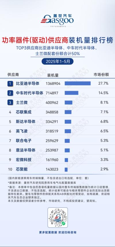 功率器件(驱动)供应商装机量排行榜(2025年1-5月)