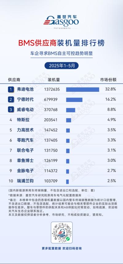 BMS供应市场中,车企寻求自主可控的趋势非常显著。弗迪电池凭借比亚迪体系优势占据超三成份额,宁德时代以16.2%稳居第二位,展现第三方供应商的强大竞争力。威睿电动、特斯拉等车企自研或自供的BMS也获得一定市场份额,表明车企对BMS自主掌控的重视。未来随着新能源汽车技术发展,BMS市场竞争格局或因技术迭代、车企供应链策略变化而改变。