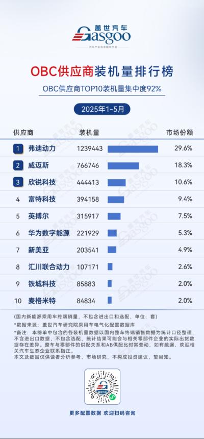 OBC供应市场中,TOP10供应商的市场份额达到92%。弗迪动力以29.6%份额居首,威迈斯、欣锐科技等紧随。头部企业凭借技术、配套优势主导,华为数字能源等跨界参与者也占得一定份额,反映市场既存供应链壁垒,也有新势力破局。未来,在技术迭代(如高压快充)与整车厂供应链策略调整下,份额或现变动,但高集中度的格局短期内将延续。