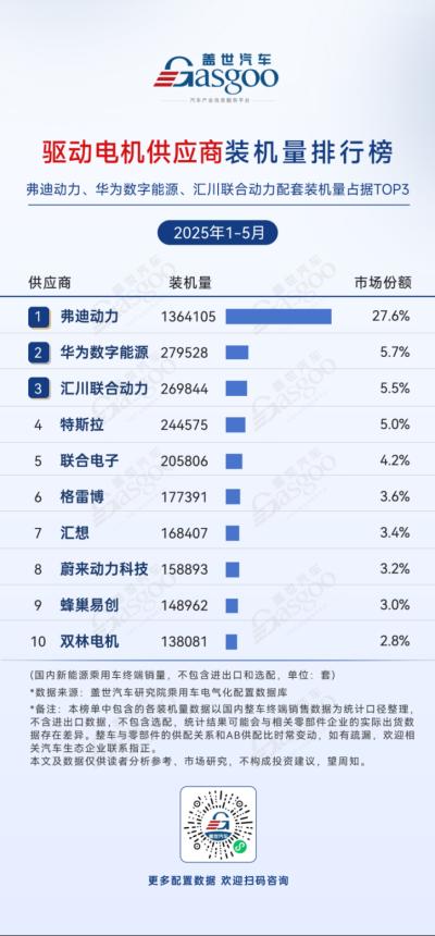 驱动电机供应商装机量排行榜(2025年1-5月)