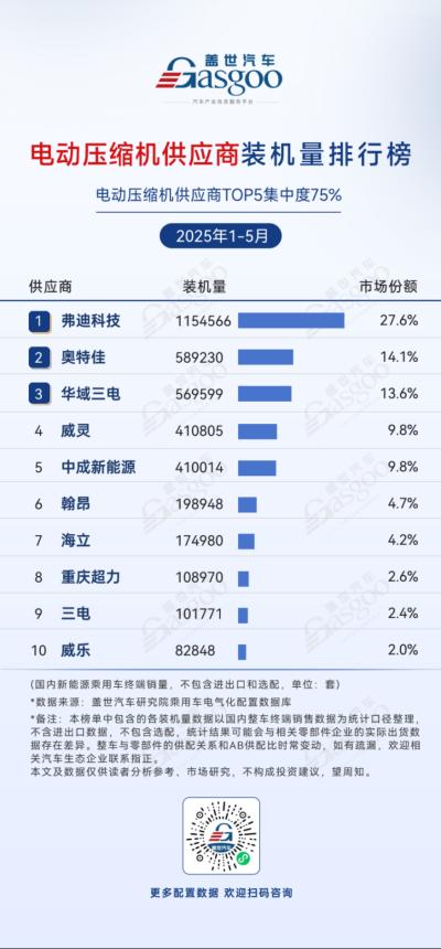 电动压缩机供应商装机量排行榜(2025年1-5月)