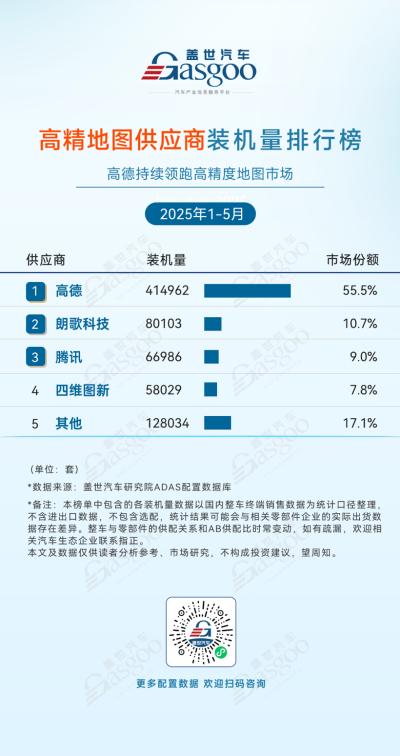 高德,1-5月装机量414962套,市场份额55.5%。