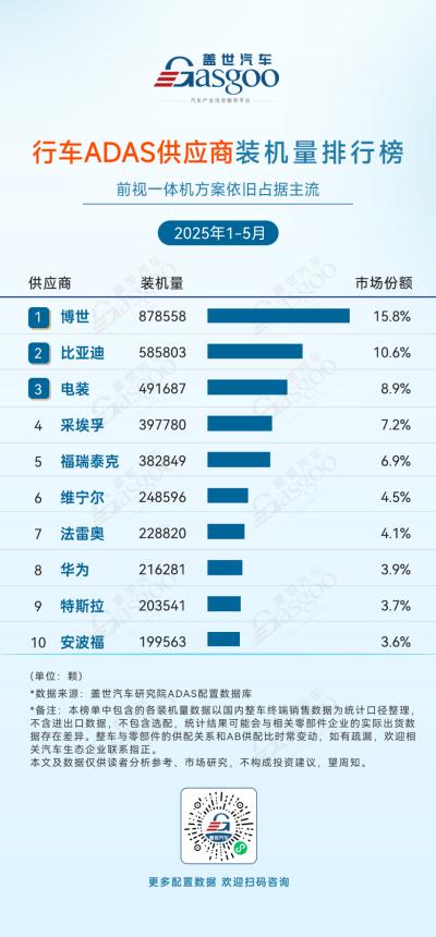 5月,汽车ADAS供应市场呈现出高度集中化与本土厂商崛起的特征。
