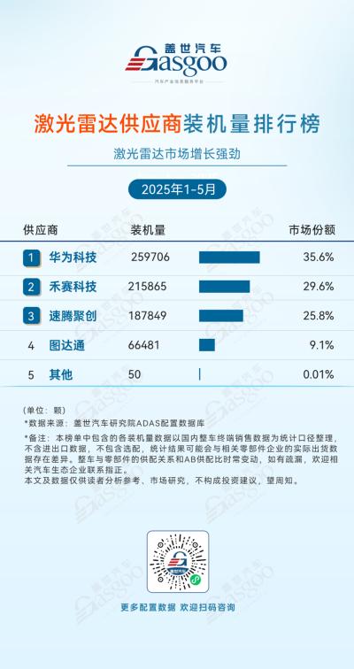 盖世汽车研究院2025年1-5月ADAS供应商装机量排行榜显示,在激光雷达领域,华为、禾赛科技、速腾聚创前三甲合计占据高达91%的市场份额,“马太效应”持续凸显。空气悬架市场则由孔辉科技、拓普集团和保隆科技三家本土厂商主导,88.4%的合计份额展现了国产替代的强劲动能。与此同时,在行车ADAS、前视摄像头乃至自动泊车领域,以比亚迪、华为、福瑞泰克等为代表的自主力量正加速渗透,挑战着博世、电装等国际巨头的传统优势,预示技术壁垒与本地化服务将成为未来竞争的关键。