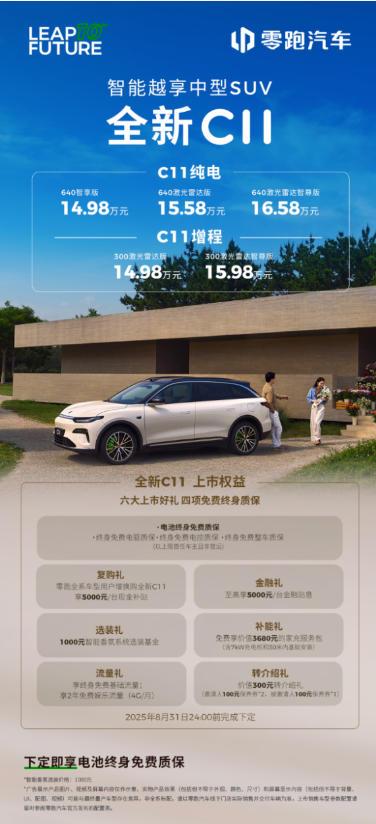 7月10日,杭州运河发布中心。零跑全新C11在四年前的同场地正式上市,售价14.98-16.58万元。新车的定价与老款几乎重叠,但配置清单却焕然一新:标配800V高压平台、60英寸AR-HUD、激光雷达、高通8650芯片——这些曾属于30万元以上车型的配置,首次下探至15万级市场。