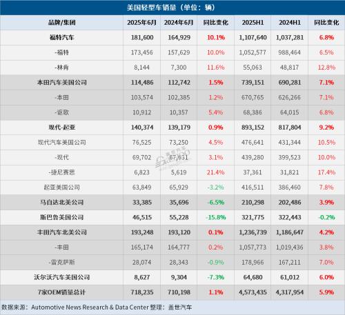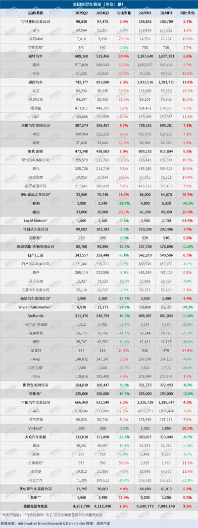 最新数据显示,今年上半年,美国新乘用车及轻型卡车的销量同比增长3.2%至8,140,775辆;其中第二季度销量同比增长2.3%至4,207,796辆,低于今年第一季度4.4%的同比增幅。自4月3日起生效的美国新进口汽车关税似乎已对一些依赖进口的品牌产生早期影响,包括奥迪、保时捷、雷克萨斯、大众、马自达和三菱等。