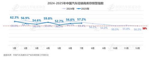 7月31日,中国汽车流通协会发布的最新一期“中国汽车经销商库存预警指数调查”显示,2025年7月,中国汽车经销商库存预警指数为57.2%,同比下降2.2个百分点,环比上升0.6个百分点,汽车流通行业景气度有所下降。