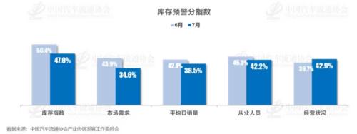 经销商反馈,7月市场热度不及6月,有47.7%的经销商认为7月整体车市呈下降趋势,且降幅超过5%。从库存预警分指数情况看:7月库存、市场需求、平均日销量、从业人员分指数环比下降,经营状况分指数环比上升。