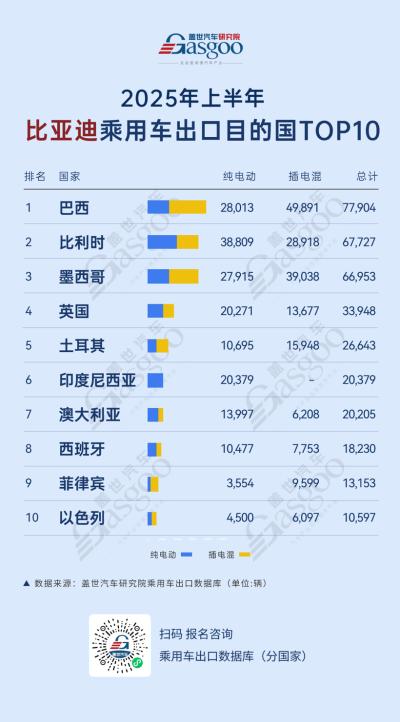NO.1巴西。2025年上半年,向巴西出口纯电动乘用车28,013辆,插电混乘用车49,891辆,总计77,904辆。