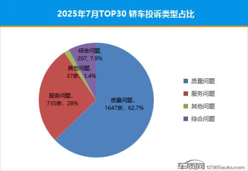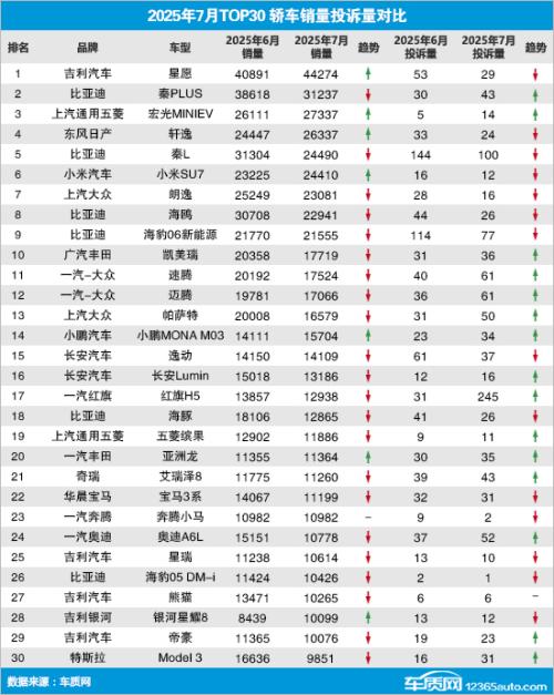 据乘联会提供的全国汽车产销数据显示,2025年7月国内轿车市场累计零售销量83.6万辆,环比下降11.8%,同比上涨6.1%。同期,车质网受理车主针对轿车的有效投诉9,679宗,环比上涨25.3%,同比上涨25.1%。去除投诉人自愿申请撤诉的信息后,2025年7月TOP30轿车销量投诉量排名如下: