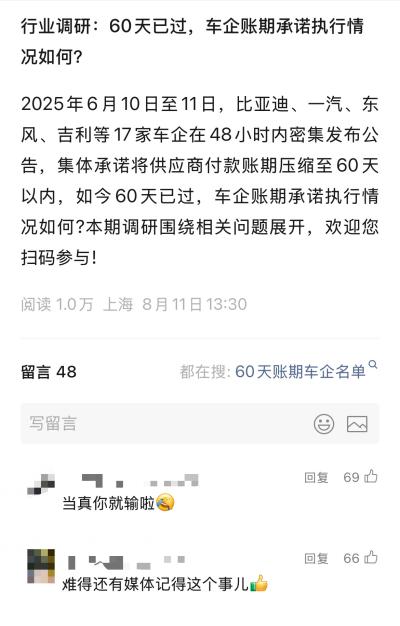 “当真你就输啦”,近期,在盖世汽车发出“60天已过,车企账期承诺执行情况如何?”这一行业调研之时,有网友如此感慨。