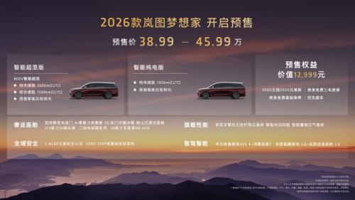 此次,2026款岚图梦想家共推出智能超混版和智能纯电版两个动力版本,预售价区间为38.99万- 45.99万。为了让消费者能更轻松地拥有这款心仪座驾,岚图同步推出了价值超万元的多项重磅权益,包括2000元抵5000元尾款的膨胀金,以及终身免费三电质保、终身免费基础保养和优先交付提车等贴心服务。从9月1日起,2026款岚图梦想家的展车和试驾车将陆续抵达各门店,届时消费者可以亲自进店体验,感受这款新车的独特魅力。