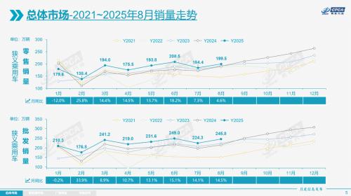 具体来看,1月,受季节性因素与消费周期影响,乘用车市场出现阶段性遇冷。但春节假期后,随着社会经济活动全面恢复,2月产销数据强势反弹,3月逐步回归常态化消费节奏。进入第二季度,国家促消费政策组合拳持续发力,各地配套措施密集落地,叠加主机厂补贴加码、金融机构信贷支持及线下车展全面重启,4月市场延续良好走势,5月、6月更呈现超强增长态势,7月虽未能继续超强增长,但零售较2023年7月176.8万的历史最高水平增长了3%,仍呈现较好增长态势,8月则呈现逐步平缓的增长态势。