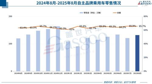 从乘联分会公布的数据来看,自主品牌在8月的表现尤为亮眼。该月自主品牌零售132万辆,同比增长9%,环比增长8.6%。市场份额方面,自主品牌8月国内零售份额高达65.7%,较去年同期增长2.3个百分点。从累计数据来看,1-8月自主品牌零售市场份额为64%,同比增长6.2个百分点,市场主导地位进一步巩固。