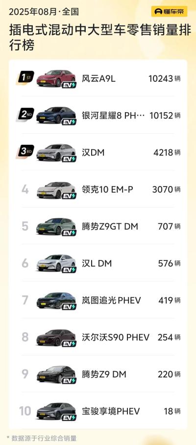 8月份,风云A9L以10243辆的卓越成绩,稳居中大型插电混动轿车细分市场第一名。这一数字的背后,是消费者用真金白银投下的信任票。更令人振奋的是,在中大型轿车市场中,风云A9L也取得了第三名的好成绩,仅次于小米SU7和奥迪A6L,超越了众多传统豪华品牌。