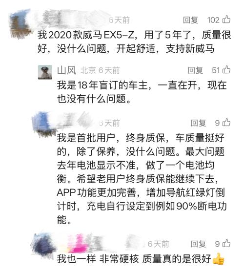 尽管在威马汽车官方图文的评论中,其本身的质量还是得到不少消费者的认可,评论称“EX5开了几年一直很稳定”、“车质量很不错,希望尽快恢复app”……