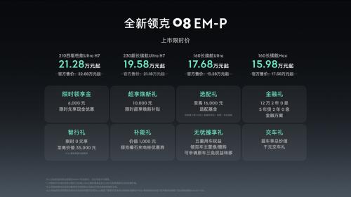 2025年9月24日,“家庭豪华智混SUV”全新领克08 EM-P正式上市。新车提供160长续航Max、160长续航Ultra、230超长续航Ultra H7、210四驱性能Ultra H7四款车型可选,官方限时价15.98万元-21.28万元。同时,伴随新车上市还有限时领享金、超享焕新礼、选配礼、金融礼、智行礼、补能礼、无忧臻享礼、交车礼在内的8重限时福利。