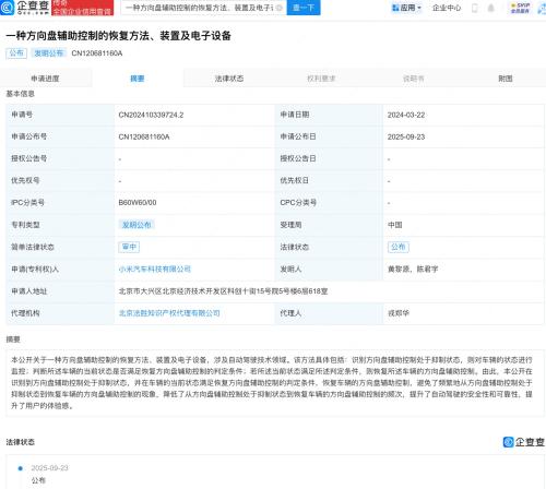 企查查APP显示,近日,小米汽车科技有限公司“一种方向盘辅助控制的恢复方法、装置及电子设备”专利公布。