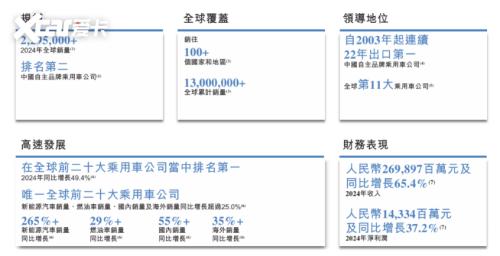 招股书显示,奇瑞汽车近三年业绩呈现“爆发式”增长:2022年至2024年,营收从926亿元增至2698亿元,复合年增长率高达70%;2024年更是创下229.5万辆全球销量纪录,位列中国自主品牌乘用车第二、全球第十一位,且成为全球前二十大乘用车企业中唯一实现新能源、燃油车、国内、海外四大板块销量同比均增长超25%企业--其中新能源销量激增265%,燃油车增长29%,国内外市场均增长超35%,这种“全品类、全市场”均衡增长态势被业界称为“奇瑞现象”。