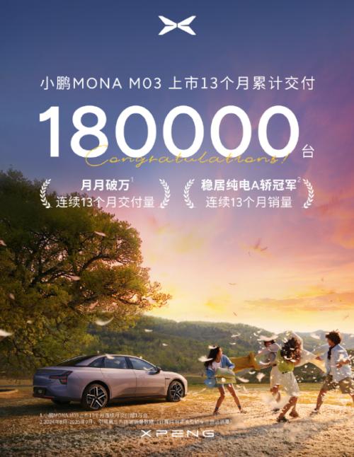 9月28日,小鹏汽车宣布,旗下的MONA M03已累计交付180000台,上市13个月连续月交付量超1万台,并连续13个月获纯电A轿销量冠军。
