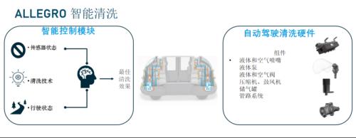 Allegro智能清洗系统的核心优势,在于智能控制模块的自适应能力:该模块可实时接收传感器反馈的状态信息,包括清洁/污浊状态,若传感器支持,还能获取污染物种类信息,以此为依据优化清洗策略;同时,系统会结合当前行驶条件(如车速、环境湿度等),通过控制器精准操作各执行部件,最终实现“多场景覆盖、低能耗、轻量化”的清洁效果。