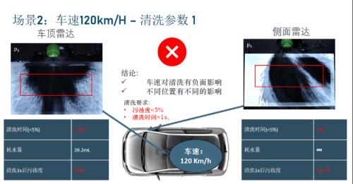 对比静态与动态测试数据可见,车速对清洗效果存在显著的负面影响,甚至可能导致清洗系统无法达到预期目标;同时,车顶与侧面雷达因安装位置不同,清洗结果存在差异——这表明不同位置的传感器受逆风环境的影响程度各不相同。显然,高速行驶下的清洁效果已无法满足整车厂的技术要求与用户的安全需求。
