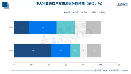 澳大利亚汽车经销商协会(AADA)委托国际经济中心近期发布的一份报告预测,到2035年,中国有望成为澳大利亚进口汽车的主要来源国。届时,中国产汽车(包括特斯拉、沃尔沃汽车和宝马等西方品牌在华工厂生产的车型)预计将占据澳大利亚汽车总销量的43%,挤压来自日本、韩国和泰国等地区的进口份额。