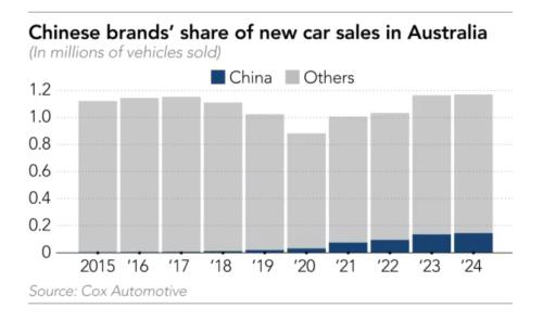 Cox Automotive的研究数据显示,过去十年,澳大利亚道路上的中国品牌汽车数量激增:2015年销量仅2,175辆,而2024年已达142,521辆,约占当地汽车总销量的12%。未来,专家预测,凭借规模、速度和成本优势,中国车企在澳大利亚可能会挤压来自日本、韩国和欧洲的传统竞争对手的市场空间。