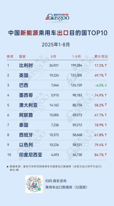 第一位,比利时。8月,向比利时出口26,921辆,1-8月累计199,284辆,同比增加17.2%。