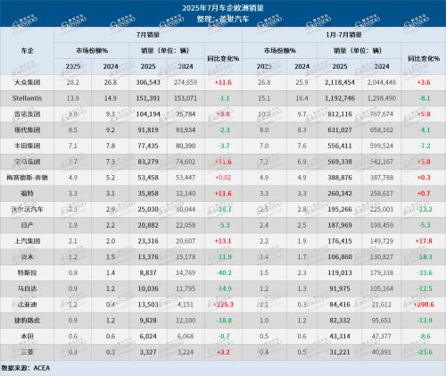 雷诺集团的销量同比上升8.8%,位列第三;其中受益于紧凑型SUV Bigster的推出,雷诺集团旗下品牌达契亚7月在欧洲的销量同比增长13.6%,达53,945辆。