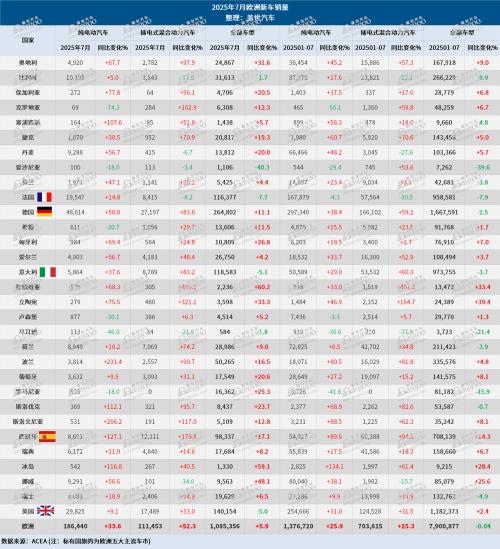 欧洲汽车制造商协会(ACEA)发布的数据显示,今年7月份,欧洲(包括欧盟、英国及欧洲自由贸易联盟)新车销量同比增长5.9%至1,085,356辆,创下自2024年4月以来的最佳月度表现。在当前消费者信心疲软的情况下,这一增长为处境艰难的欧洲汽车行业带来提振。