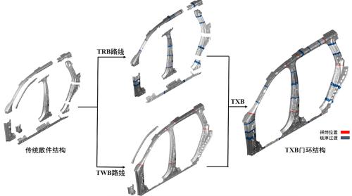传统车身结构通常采用TRB或TWB两类技术路线。TRB技术能够较好的实现单个零件的轻量化,但在集成化方面由于仍采用点焊进行多个零件的连接,集成化效率较低;TWB技术则正好相反,其在板材阶段通过激光焊连接多个不同材料的等厚度钢板实现较好的零件集成化,但在零件局部加强上则需要通过打补丁的方式,无法实现极致的轻量化。
