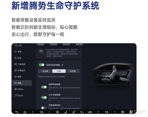 腾势生命守护系统:新增智能识别设备,可实时监测车内状况,并结合生理指标判断进行“贴心提醒”,为出行安全再添一道“隐形屏障”,让每一段旅程更安心。