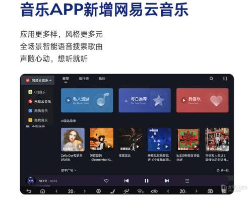 音乐生态扩容:车机新增网易云音乐APP,搭配“全场景智能语音搜歌”功能,无论是小众民谣还是热门单曲,“一句话”就能轻松播放,多元音乐库让旅途不再枯燥。