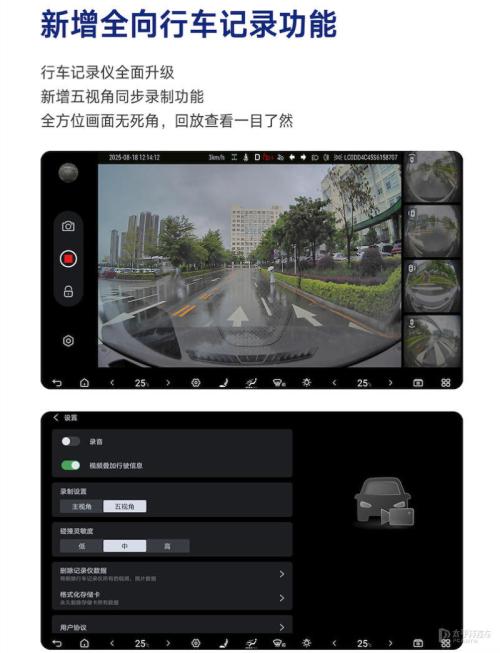 全向行车记录:行车记录仪全面进化,支持五视角同步录制(覆盖车辆周围全维度)。日常行车留痕、事故回溯取证,都能获得“无死角”的清晰画面支持。