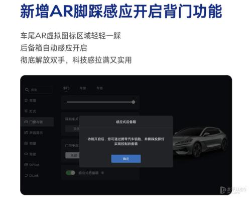 AR脚踩开背门:车尾设置AR虚拟图标区域,轻踩该区域即可触发后备箱自动开启。像逛超市满载而归的时候只需要“脚一踩”就能放行李,彻底解放双手,科技感与实用性兼具。