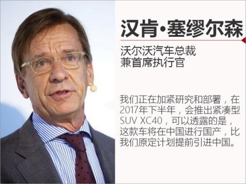 沃尔沃目前已经在华推出了90、60、40系列12款产品。今年,40系列一款全新产品将在华发布。沃尔沃汽车总裁兼首席执行官汉肯·塞缪尔森表示:“我们正在加紧研究和部署,2017年下半年,会推出XC40。”沃尔沃XC40是一款SUV,未来上市后将与宝马X1等同级别车型展开竞争。