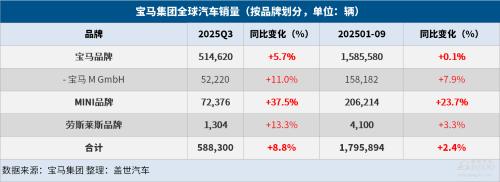 其中第三季度,宝马集团的全球汽车交付量同比增长8.8%至588,300辆,延续了此前的增长态势。这也反映出去年同期销量疲软所带来的基数效应产生了积极影响。