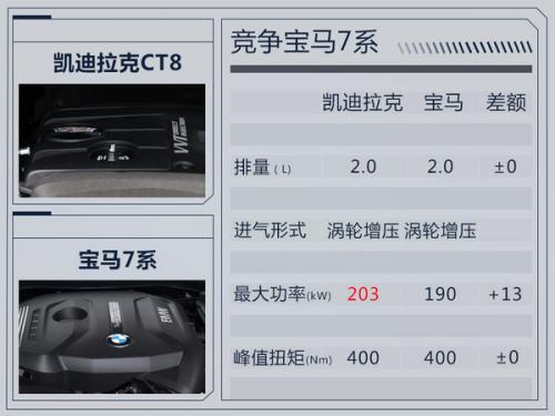 CT8预计将搭载2.0T、3.0T两款发动机,最大功率分别为203kW、298kW,峰值扭矩400Nm、543Nm。CT8搭载的2.0T发动机相比于宝马7系的2.0T(190-400)最大功率输出上占据优势。此外,CT8预计将搭载凯迪拉克全新开发的4.2T双涡轮增压发动机。