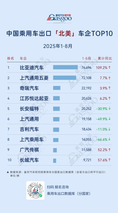 NO.1比亚迪汽车。2025年1-8月,向北美出口76,696辆,累计同比增加109.2%。