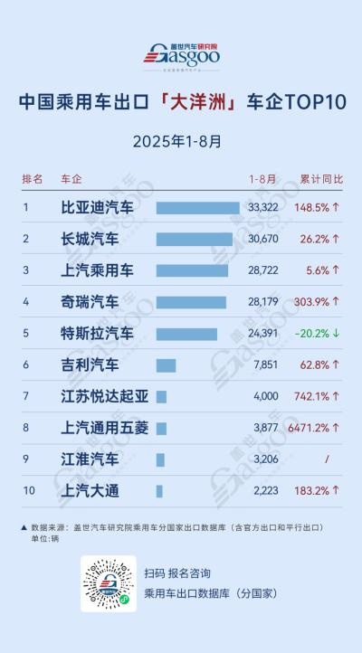 NO.1比亚迪汽车。2025年1-8月,向大洋洲出口33,322辆,累计同比增长148.5%。