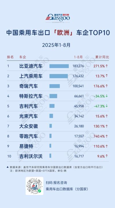 头部企业中,比亚迪汽车以271.5%的超高同比增速持续“领跑”,1-8月出口量攀升至183,276辆,较前期进一步扩大优势,彰显其在电动化技术迭代、全球化战略深化下,对欧洲市场的渗透力与突破力;上汽乘用车出口176,432辆,以13.7%的同比增速保持稳健节奏;奇瑞汽车出口量突破10万辆、达100,541辆,176.6%的同比高增长依旧释放强劲势能,体现产品竞争力与欧洲区域市场深耕的成效。