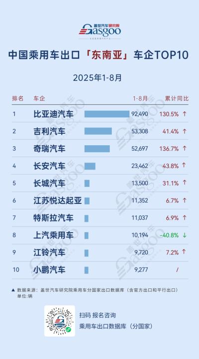 NO.1比亚迪汽车。1-8月,向东南亚出口92,490辆,累计同比增加130.5%。
