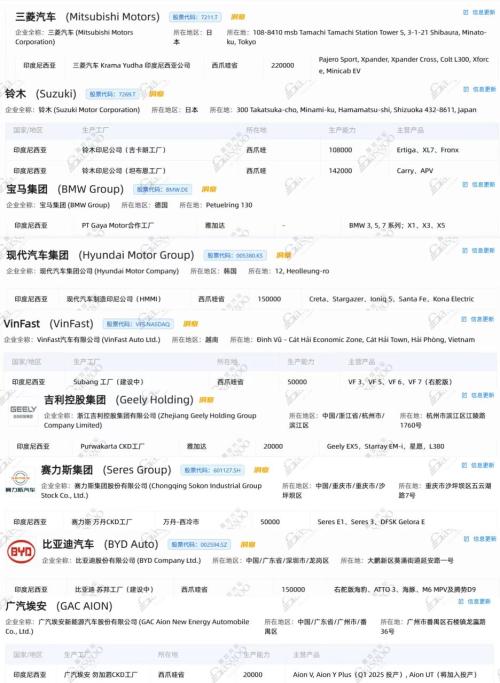 本田同样在卡拉旺工厂扎根,聚焦紧凑型车和SUV,以时尚设计和燃油经济性赢得年轻消费群体。三菱在西爪哇省芝卡朗(Cikarang)建有研发和生产一体化工厂,主攻MPV和SUV,面向家庭用户,价格亲民,在三四线城市渗透率高。大发共享丰田生产平台,专注微型及小型入门级车型,以低成本和高性价比覆盖下沉市场。铃木在芝卡朗和淡汶(Tambun)布局工厂,产品低油耗、低维护,适应印尼城市路况,在家庭用户中认可度高。