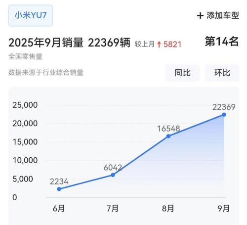 9月,小米YU7以22369辆的销量环比激增35.2%,首次超越问界M8(21244辆,环比下降1.4%),跻身乘用车零售TOP15,成为新能源市场又一“黑马”车型。