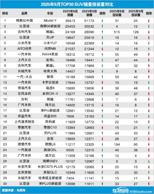 据乘联会提供的全国汽车产销数据显示,2025年9月国内SUV市场累计零售销量113.1万辆,环比上涨11.8%,同比上涨9.1%。同期,车质网受理车主针对SUV的有效投诉7,157宗,环比下降5.8%,同比上涨45.1%。去除投诉人自愿申请撤诉的信息后,2025年9月TOP30 SUV销量投诉量排名如下:
