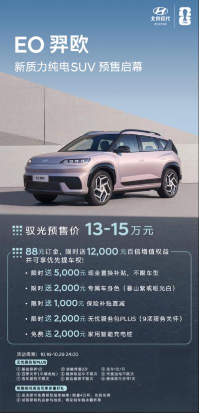 北京现代EO羿欧于10月16日正式启动预售,驭光版预售价13-15万元。作为北京现代首款纯电平台SUV,EO羿欧的推出标志着这家深耕中国市场23年的合资车企,开启新能源战略转型后新产品正式落地。