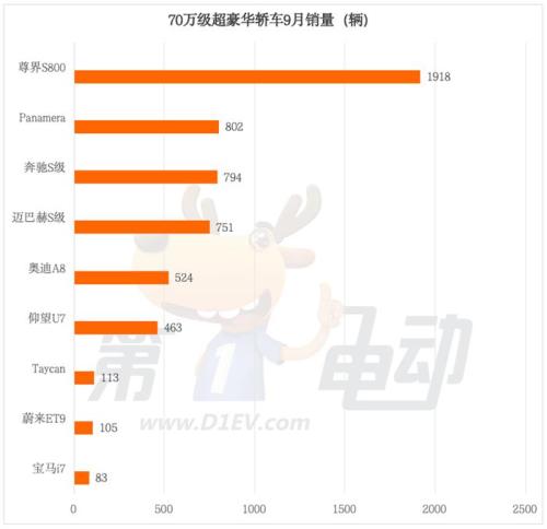 从具体车型表现来看,榜单头部梯队分化明显,形成“一超多强”的竞争格局。尊界S800以1918辆的销量强势登顶,不仅创下该细分市场国产车型单月销量纪录,更以超1100辆的优势拉开与第二名的差距,相当于Panamera(802辆)与奔驰S级(794辆)的销量总和。