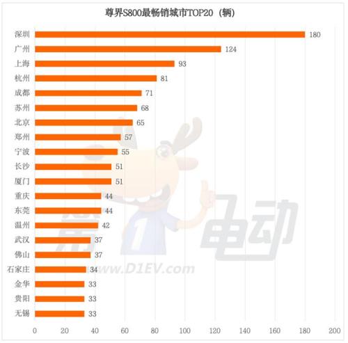 那么哪个城市的消费者最爱尊界S800呢?在TOP20榜单中,深圳以180辆的销量成绩强势登顶,成为尊界S800最受欢迎的城市,远超其他城市的销售表现,展现出深圳消费者对该车型的高度认可。