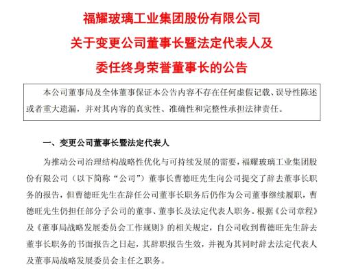 按照公告,根据《公司章程》及《董事局战略发展委员会工作规则》的相关规定,自公司收到曹德旺辞去董事长职务的书面报告之日起,其辞职报告生效,并视为其同时辞去法定代表人及董事局战略发展委员会主任之职务。